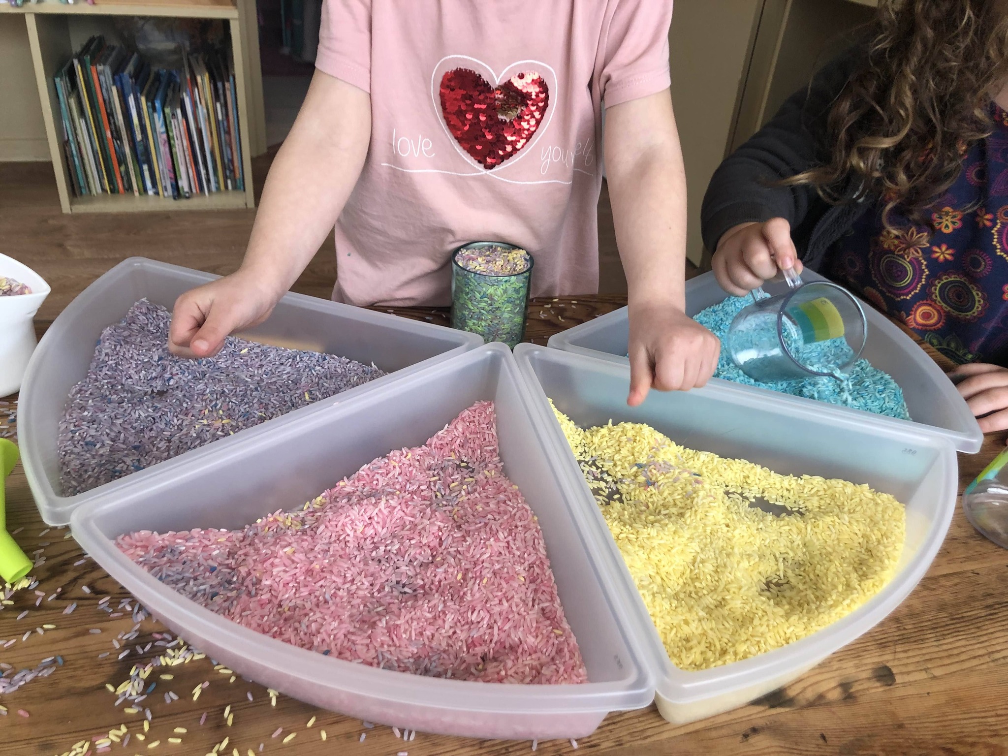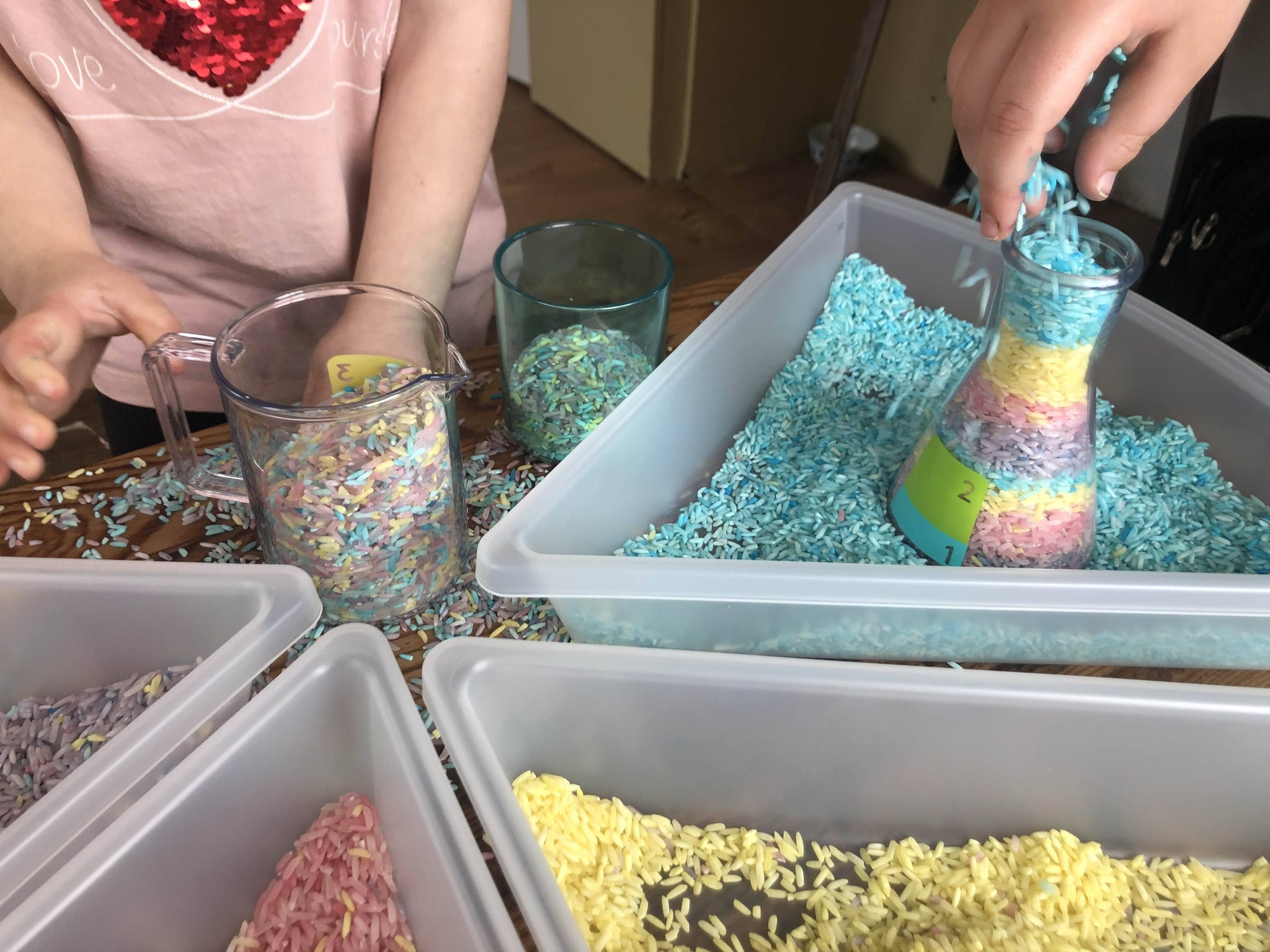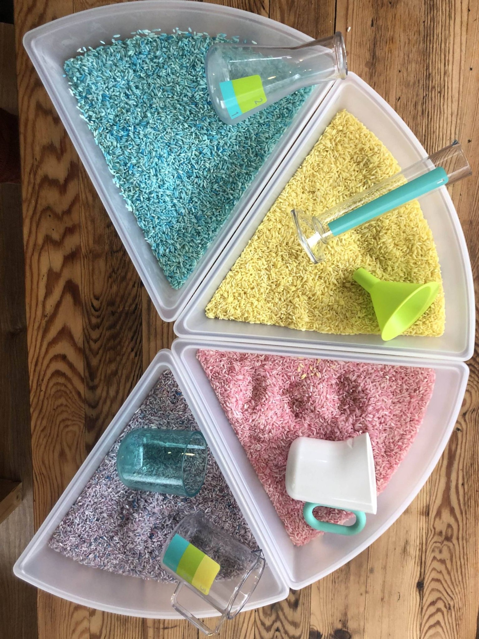 - Disposez le riz dans des petits plateaux ou contenants. Sortez les cuillères, les tasses, les entonnoirs et c'est parti !