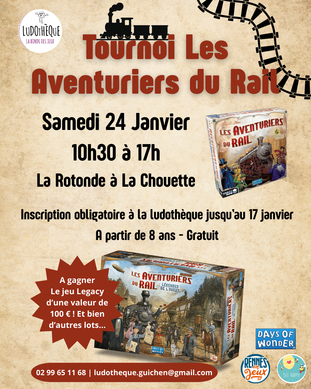 🎁 De nombreux lots sont à gagner, dont le jeu Les Aventuriers du Rail – Legacy, d'une valeur de 100 € ! Une belle occasion de jouer, de partager… et de tenter votre chance 😄